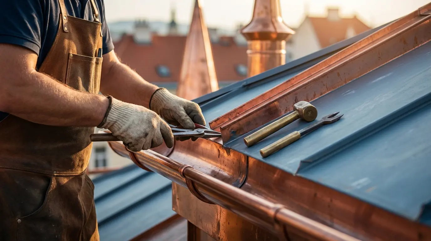 Die Kosten hängen vom Material ab: Dachrinne Zink ab 38 €/lfm, Kupfer ab 65 €/lfm. Verblechungen ab 48 €/lfm. Alle Preise sind Festpreise inklusive Montage. Anfahrt Wien kostenlos.